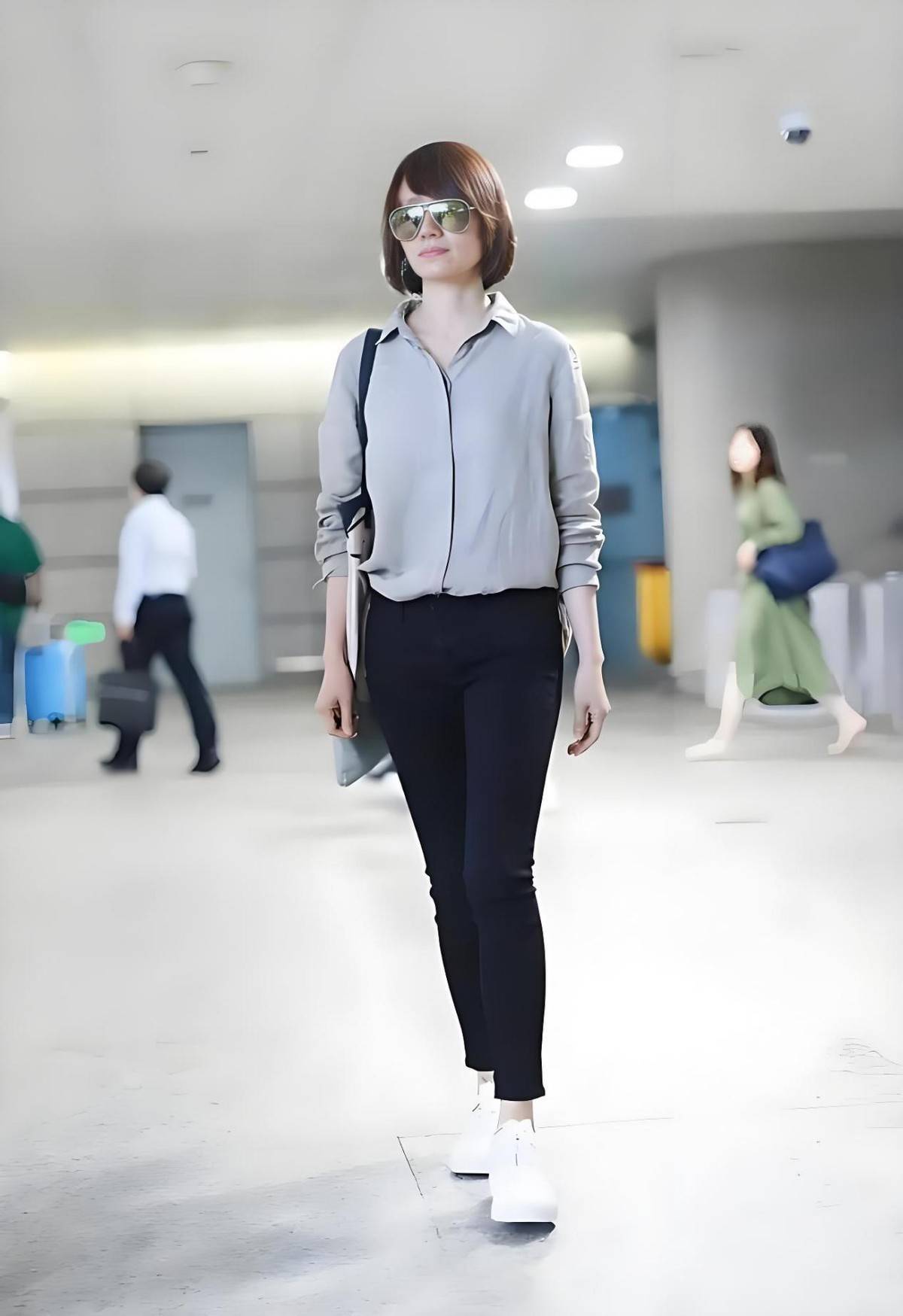 袁泉向来是“低调派”,无论是为人处世还是穿衣打扮,都从不高调张扬。像这一套灰色衬衫和小黑裤的组合,看似简单实则颇具品味,衣摆塞进裤腰特别显腿长。